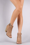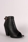 These western-inspired booties feature a peep toe silhouette, perforated detail, adjustable side buckle closure, and stacked chunky heel. Finished with a lightly padded insole and side zip-up closure.