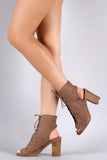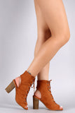These stylish booties feature a peep-toe silhouette, lace-up front with gold pointed tip, back cutout design with stitching detail, and chunky stacked heel. Finished with a cushioned insole for comfort.