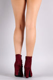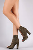 These commanding booties features a vegan suede upper, peep toe silhouette, elasticized strap construction across vamp, and wrapped chunky heel. Finished with a lightly padded insole for comfort and side zip-up closure for easy on/off.