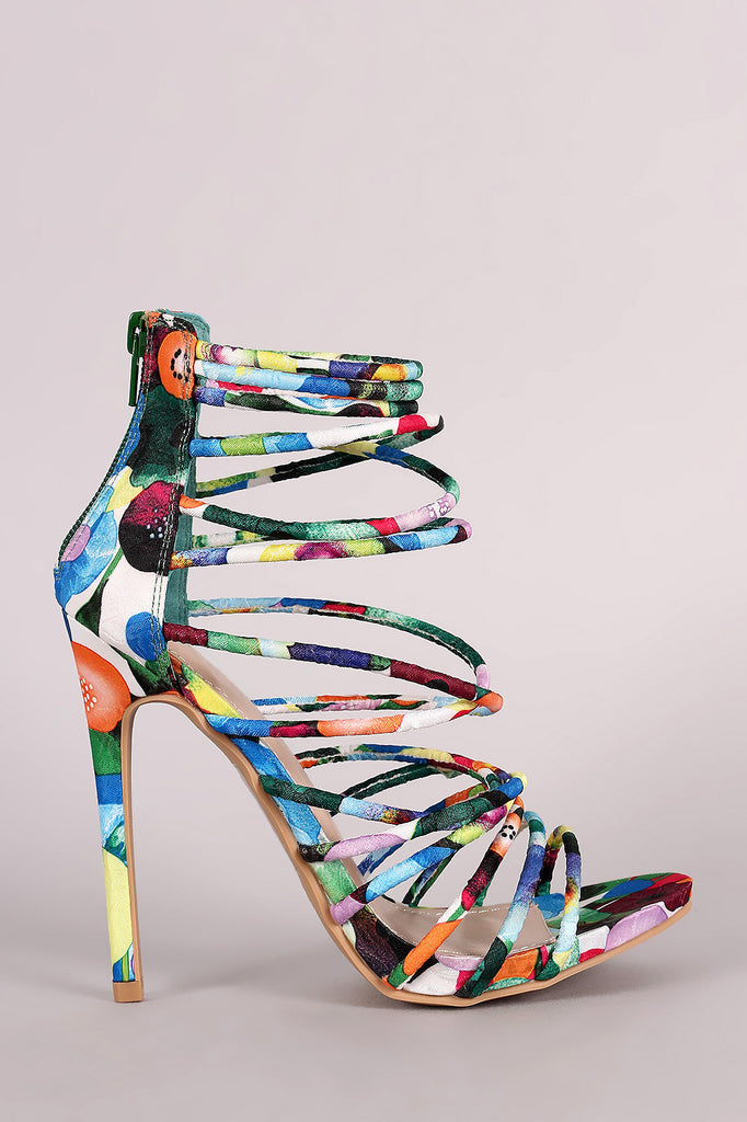 This colorful  heel  features a watercolor floral print throughout, multiple laddered tube straps across vamp, open toe silhouette, and wrapped stiletto heel. Finished with a rear zip-up closure, and lightly cushioned insole.