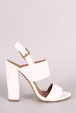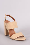 This open toe heel features a chunky wrapped heel, double band construction, lightly padded insole, and adjustable slingback strap with buckle fastening.
