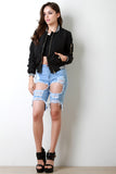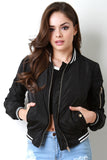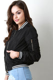 This bomber jacket features a windbreaker fabrication, striped elastic rib knit trim, front zip up closure, left sleeve utility pocket, and two front pockets with snap button closures. Accessories sold separately. Self: 100% Polyester, Lining: 100% Polyester.