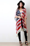 This poncho features lightweight woven fabrication, The American Flag print with contrasting fringe trim on an asymmetrical hemline. Accessories sold separately.
