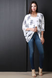 This kimono top features floral embroidery design at front, semi-sheer floral lace back, quarter-length sleeves, and open front. Accessories sold separately. Made in U.S.A. 100% Rayon.
