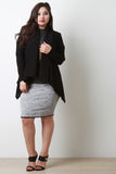 A plus size ribbed knit cardigan featuring an open front, long sleeves, and handkerchief hemline. Accessories sold separately. Made in USA. 95% Polyester, 5% Spandex.