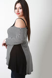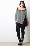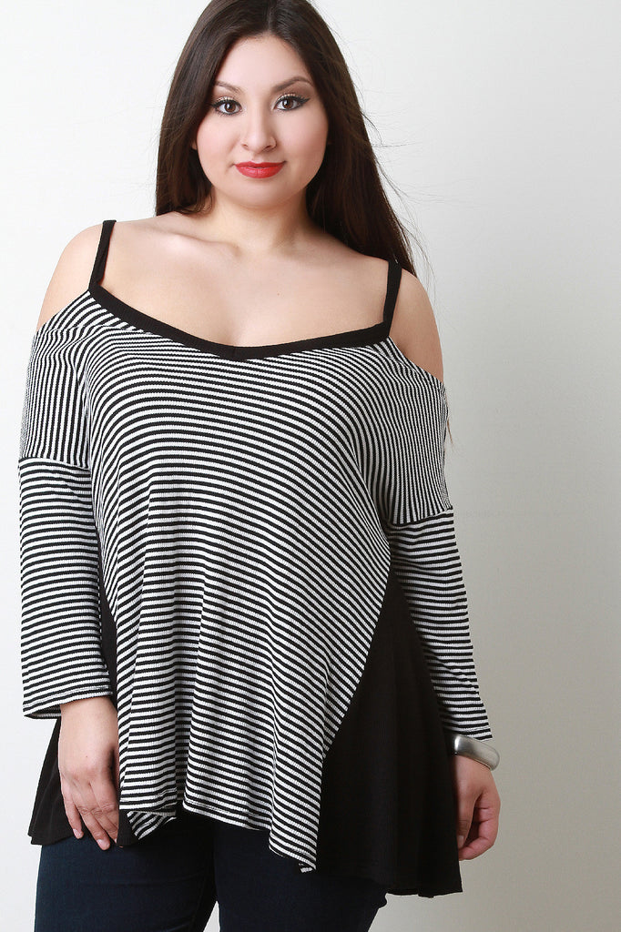 A plus size trapeze striped ribbed knit , and contrasting solid panels at the sides. Accessories sold separately. Made in USA. 95% Rayon, 5% Spandex.