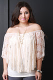 This plus size top features semi-sheer lace, elasticized off the shoulder neckline, open sides, and jersey knit lining. Finished with gold-tone chain and faux pearl necklace. Accessories sold separately. 92% Nylon, 8% Spandex. Contrast: 97% Rayon, 3% Spandex.