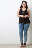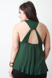 This plus size top features a jersey knit fabrication, round neckline, sleeveless, racerback with cutout construction, princess seam front, and a cinched flare silhouette. Accessories sold separately. Made in U.S.A. 95% Rayon, 5% Spandex.