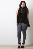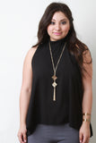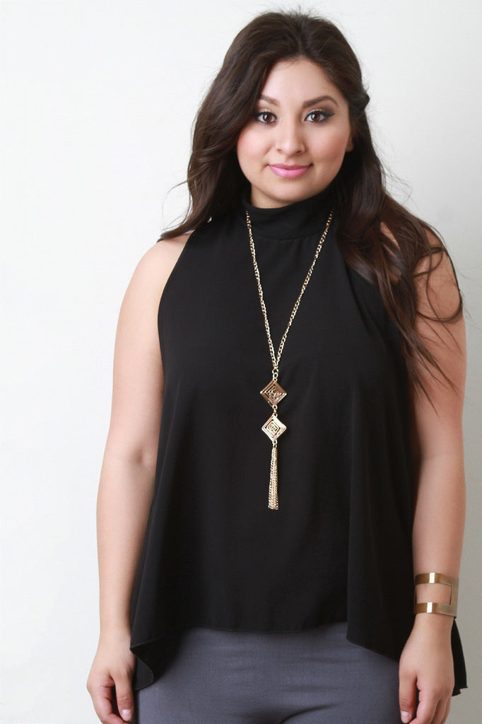 This plus size top features a mock neckline, sleeveless design, zipper back, trapeze cut fit, high low hemline, and includes long charm necklace. Accessories sold separately. Made in U.S.A. 99% Polyester, 1% Spandex.