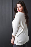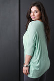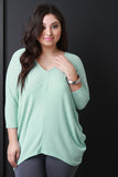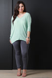 This plus size loose knit top features a v-neckline, dolman sleeves design, center seams detail, and sharkbite hemline. Accessories sold separately. Made in U.S.A. 48% Polyester, 48% Rayon, 4% Spandex.