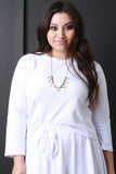 This plus size top features a jersey knit fabrication, round neckline and three quarter sleeves. Finished with a crop hemline. Accessories sold separately. 60% Polyester, 35% Cotton, 5% Spandex.