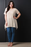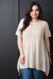 This casual plus size top features a round neckline, short sleeves, hacci knit fabrication and finished with a sharkbite hemline. Accessories sold separately. Made in U.S.A. 62% Rayon, 38% Polyester.