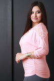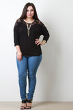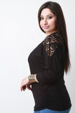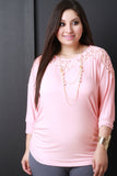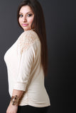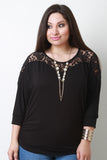 This plus size top features a semi-sheer floral lace yoke, round neckline, quarter-length dolman sleeves, ruched sides, and finished with a long chain necklace. Accessories sold separately. Made in U.S.A. 97% Viscose, 3% Spandex.