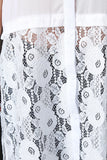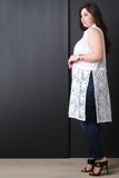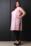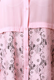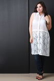 This top features the classic shirt collar, semi-sheer fabrication with contrasting floral lace bottom, sleeveless construction, and button-up front. Finished with two side slits. Accessories sold separately. 65% Polyester, 35% Nylon.