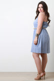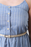 This  striped  knit fabrication, scooped neck with spaghetti shoulder straps, button up front, and gathered waistline with contrast belt. Accessories sold separately. Made in U.S.A. 100% Cotton.