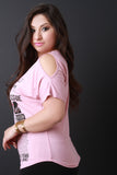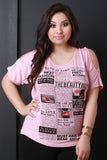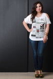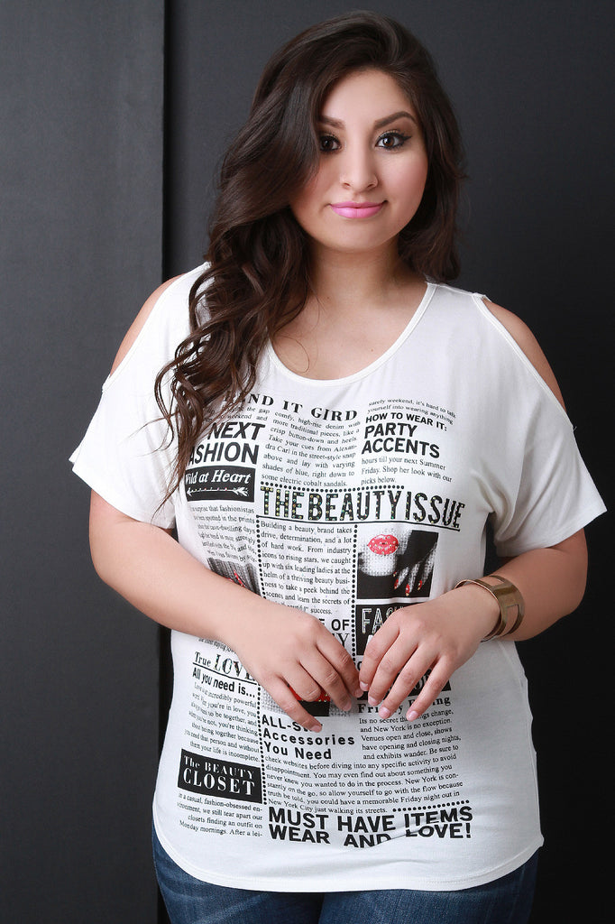 This plus size top features a fashion newsletter graphic print with rhinestone details, bat wing style, short sleeve with cold shoulder cut out, rounded neckline, and soft knit fabrication. Accessories sold separately. 97% Rayon, 3% Spandex.