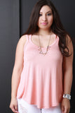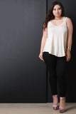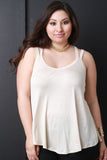 This plus size top features a jersey knit fabrication, scoop neckline, double thin shoulder straps to a v-back, and rounded flowy hemline. Accessories sold separately. Made in U.S.A. 97% Rayon, 3% Spandex.