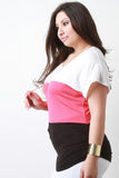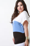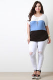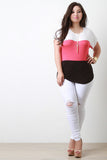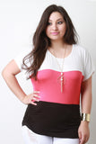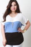 This plus size top features a jersey knit fabrication, colorblock design, round neckline, short sleeves construction, and includes a necklace. Finished with a cinched side with rounded hemline. Other accessories sold separately. Made in U.S.A. 97% Rayon, 3% Spandex.