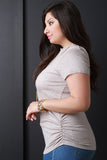 This  plus size top  features rib knit, mock neck, short sleeves, ruched sides, and back keyhole cutout. Accessories sold separately. 97% Rayon, 3% Spandex.