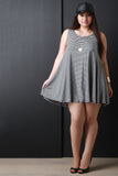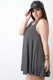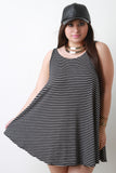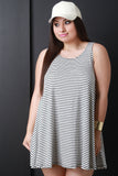 This  plus size sleeveless dress  features a soft jersey knit fabrication with stripe print throughout, scoop neckline, and flowy shift cut fit. Accessories sold separately. Made in U.S.A. 95% Rayon, 5% Spandex.