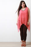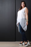 This plus size top features a woven knit fabrication, detailed round neckline with beads, sleeveless fit, and finished with an asymmetrical wrapped hemline. Accessories sold separately. 100% Polyester.