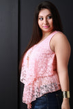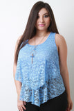 This adorable plus size top features a stretch lace and knit fabrication, square pointed front hem, cropped back, sleeveless design and a scoop neckline. Necklace is included. Other accessories sold separately. 92% Nylon, 8% Spandex. Contrast: 97% Rayon, 3% Spandex