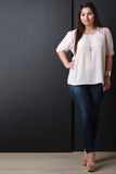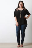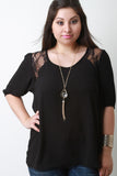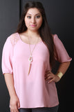 This beautiful blouse features a scoop neckline, floral lace yoke detail around shoulder area, a flare hemline, back keyhole button closure, and lightweight woven fabrication. Finished with gathered elastic hem details on sleeves. Includes long charm diamond necklace. Accessories sold separately. Made in U.S.A. 100% Polyester 92% Nylon 8% Spandex.