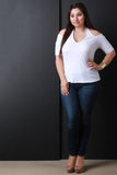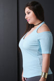 This sexy plus size top features a cold shoulder design, v-neckline, halter straps, half sleeves, and finished with a soft knit fabrication. Accessories sold separately. Made in U.S.A. 48% Polyester 48% Cotton 4% Spandex.