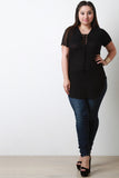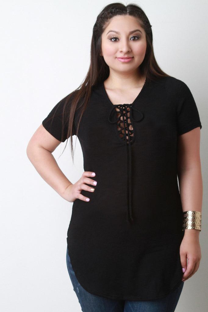 This top features a ribbed knit fabrication, deep v-neckline with strappy lace-up closure, short sleeves fit, and rounded hemline. Accessories sold separately. Made in U.S.A. 67.5% Rayon, 21.2% Polyester, 11.3% Spandex.