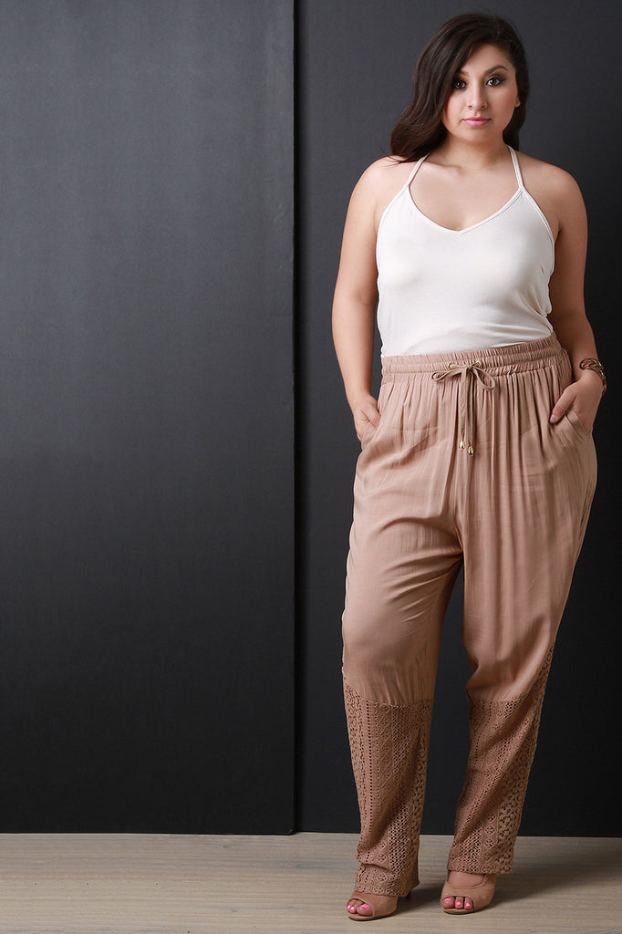 This plus size harem pants features a lightweight fabrication, harem style design, elasticized waistband with self-tie drawstring, side slit pockets, and taper cut legs with crochet hem. Accessories sold separately. 96% Polyester, 4% Spandex.