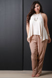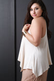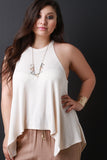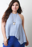 This cute plus size top features a mock neckline, sleeveless cut in shoulder design, stripe pattern, racerback, wide shark bite hemline, loose flowy fit. Accessories sold separately. Made in U.S.A. 95% Rayon 5% Spandex.