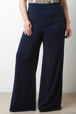 These plus size pants feature a wide leg cut, stretchy soft knit fabrication, and finished with a fold over waist band. Accessories sold separately. Made in U.S.A. 95% Polyester, 5% Spandex.