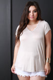 This plus size tee features a soft knit fabrication, v neckline, relaxed fit, short sleeves, and a eyelet trim at the neckline. Accessories sold separately. Made in U.S.A. 95% Rayon, 5% Spandex.