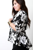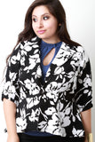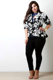 This plus size blazer features a thick knit fabrication, abstract floral print pattern, ruched three quarter sleeves, and front single button closure. Finished with a wide collar, and high-low hemline. Accessories sold separately. Made in U.S.A. 96% Polyester, 4% Spandex.