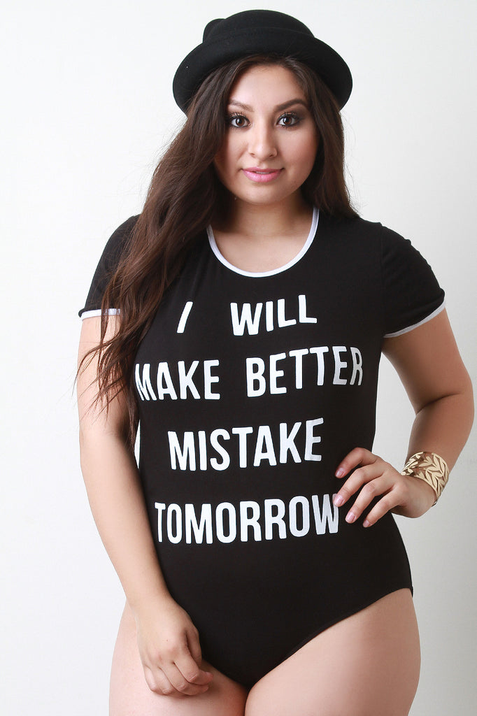 This plus size bodysuit features a "I Will Make Better Mistake Tomorrow" graphic print at front, jersey knit with contrast trims, short sleeve, and finished with double snap button closure at crotch for easy on/off. Accessories sold separately. Made in U.S.A. 95% Cotton, 5% Spandex.