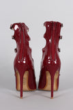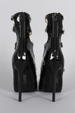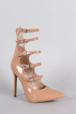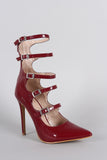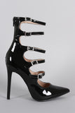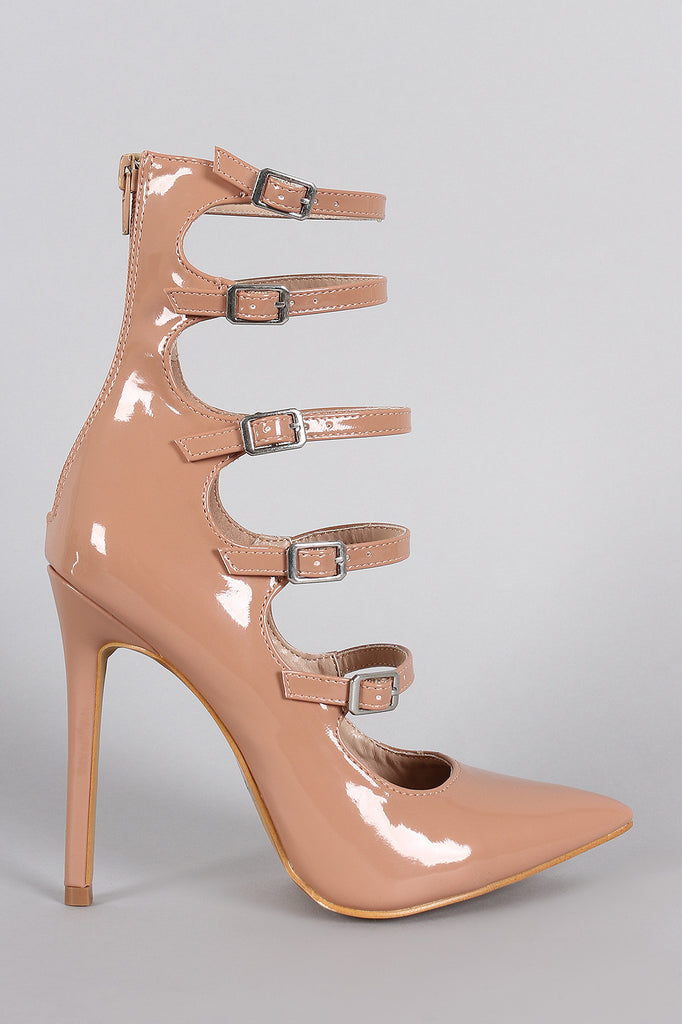 This stiletto pointy toe silhouette, ladder-style buckle straps, lightly padded insole, and rear zipper closure for easy on/off.