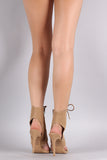 These stylish open toe silhouette, lace up front, cutout design with corset detail at the back, velvet fabrication, low platform, pointed metal aglets, and wrapped stiletto heel. Finished with cushioned insole and side zipper closure for easy on/off.