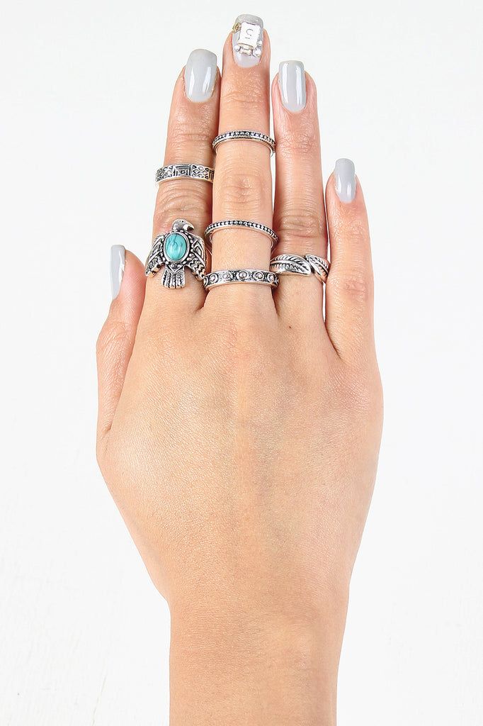 This set of six rings features tribal patterned nonadjustable bands, a metallic leaf ring, and a turquoise eagle ring.