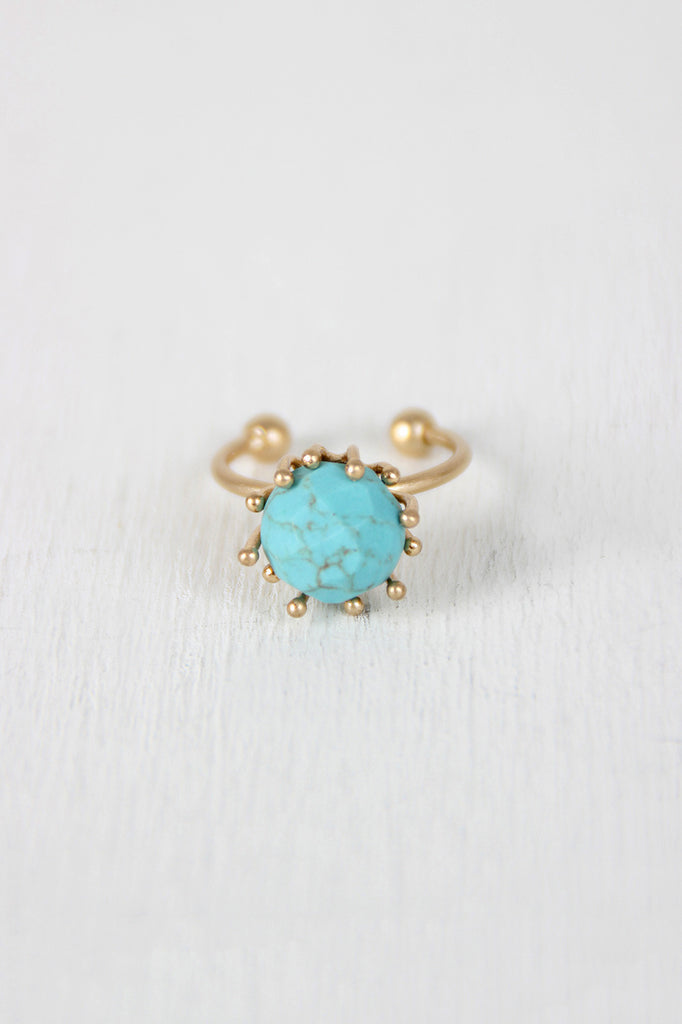 This unique ring features a faux turquoise stone nestled on a claw-like frame, finished with a polished metal open-ended band. Non-adjustable.