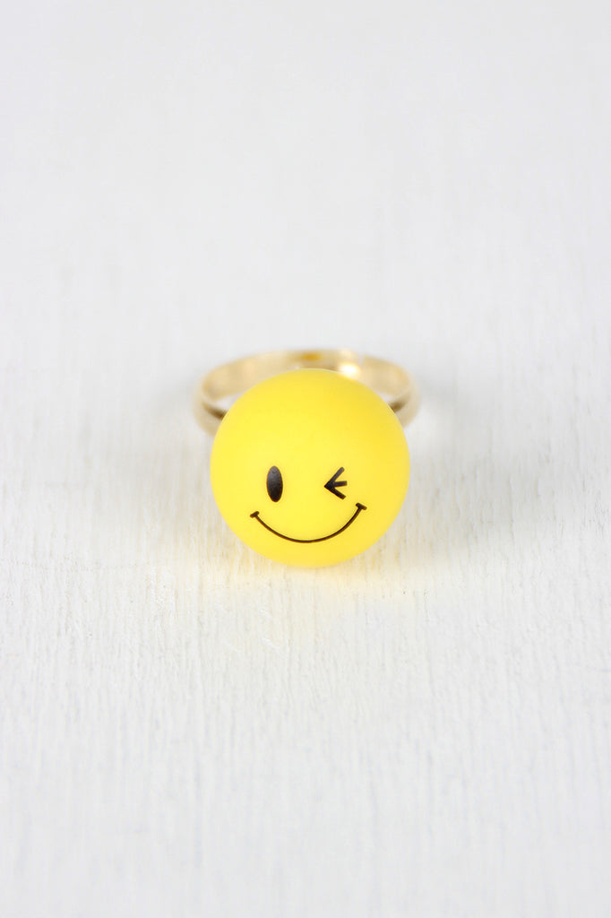 This flirty ring features a yellow sphere with the winking emoji on it, finished with a high-polished metal frame. Adjustable.