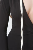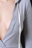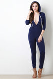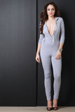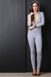 This jumpsuit features a drawstring hood with plunging neckline, long sleeves, a jersey knit fabrication, and finished with taper cut legs. Accessories sold separately. Made in U.S.A. 95% Cotton, 5% Spandex.