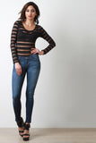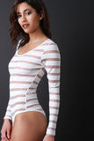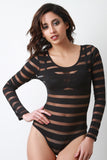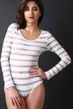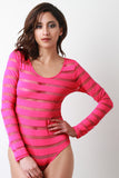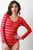 This bodysuit features a semi-sheer stripe mesh fabrication, round neckline, long sleeves and double snap button closure at crotch. Accessories sold separately. Made in U.S.A. 92% Polyester, 8% Spandex.