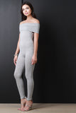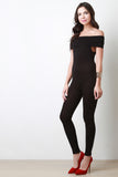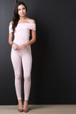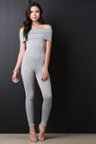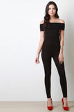 This sleek jumpsuit features soft jersey knit, off the shoulder design, subtle cut-outs, and taper cut legs. Accessories sold separately. Made in U.S.A. 95% Rayon, 5% Spandex.