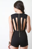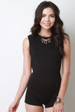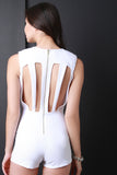 This fitted romper features a round neckline, sleeveless construction with shoulder padding, and shorts bottom half. Finished with a cage back design and a zipper fastener at back. Accessories sold separately. Made in U.S.A. 67% Viscos, 28% Nylon, 5% Spandex.