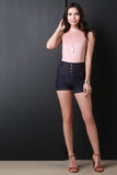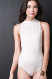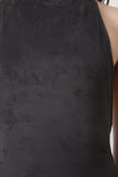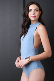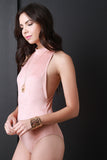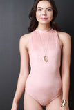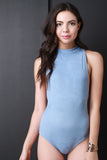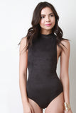 This sleeveless bodysuit features a vegan suede fabrication, mock neckline, and razorback silhoutte. Finished with a double button snap closure at crotch for easy on/off. Accessories sold separately. Made in U.S.A. 90% Polyester, 10% Spandex.