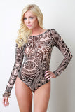 This sheer mesh bodysuit features long sleeves, high rounded neck, and a low cut back. Made in U.S.A. Accessories sold separately. 100% Polyester.