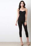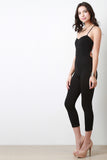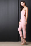 This classic jumpsuit features a textured stretchy knit fabrication, thin lace up back strap closure, and open back construction. Finished with a cinched high waisted seam, and taper cut legs. Accessories sold separately. Made in U.S.A. 95% Polyester, 5% Spandex.