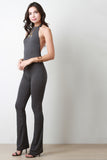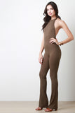 This jumpsuit features a ribbed knit fabrication, halter neckline, and open back construction. Finished with two button hooks at nape, and bell bottom cut legs. Accessories sold separately. Made in U.S.A. 63% Polyester, 32% Rayon, 5% Spandex.