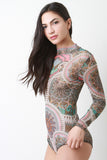 This bodysuit features a semi-sheer sublime mesh fabrication, tribal print throughout, long sleeves construction, and mock neckline. Finished with a double snap button closure at crotch. Accessories sold separately. Made in U.S.A. 100% Polyester.