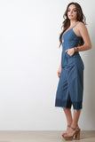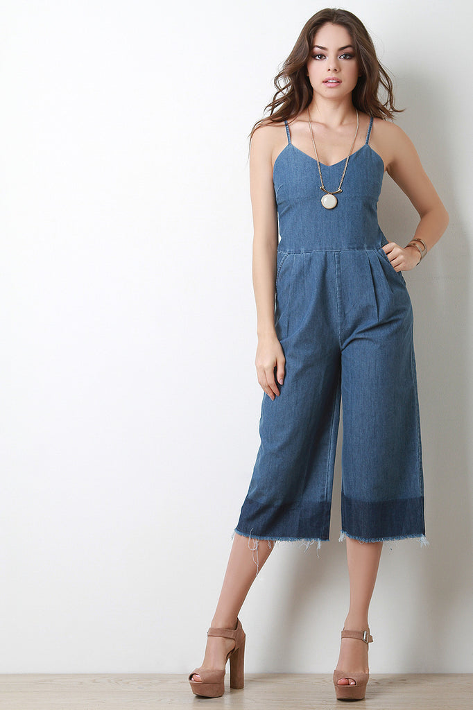 This jumpsuit features a sweetheart neckline, spaghetti straps, frayed cropped hemline, wide leg fit, and two front pockets. Finished with a rear zip-up closure. Accessories sold separately. 80% Cotton, 18% Polyester, 2% Spandex.